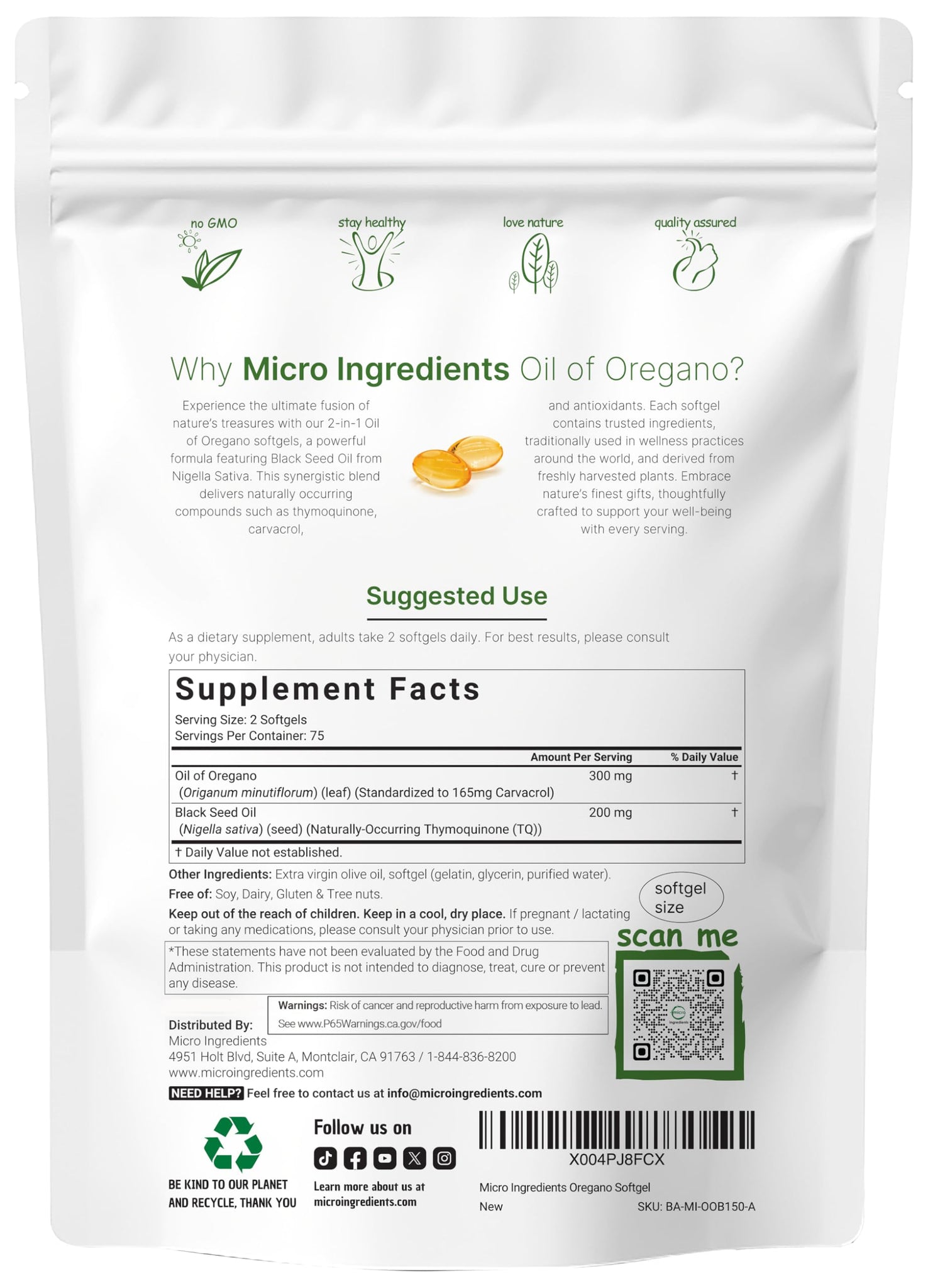 - Premium non-GMO oregano oil supplements. Made without soy, dairy, gluten, preservatives, flavors, and tree nuts. Ingredients must pass a 3rd party lab test to ensure our product is safe, pure, and potent.