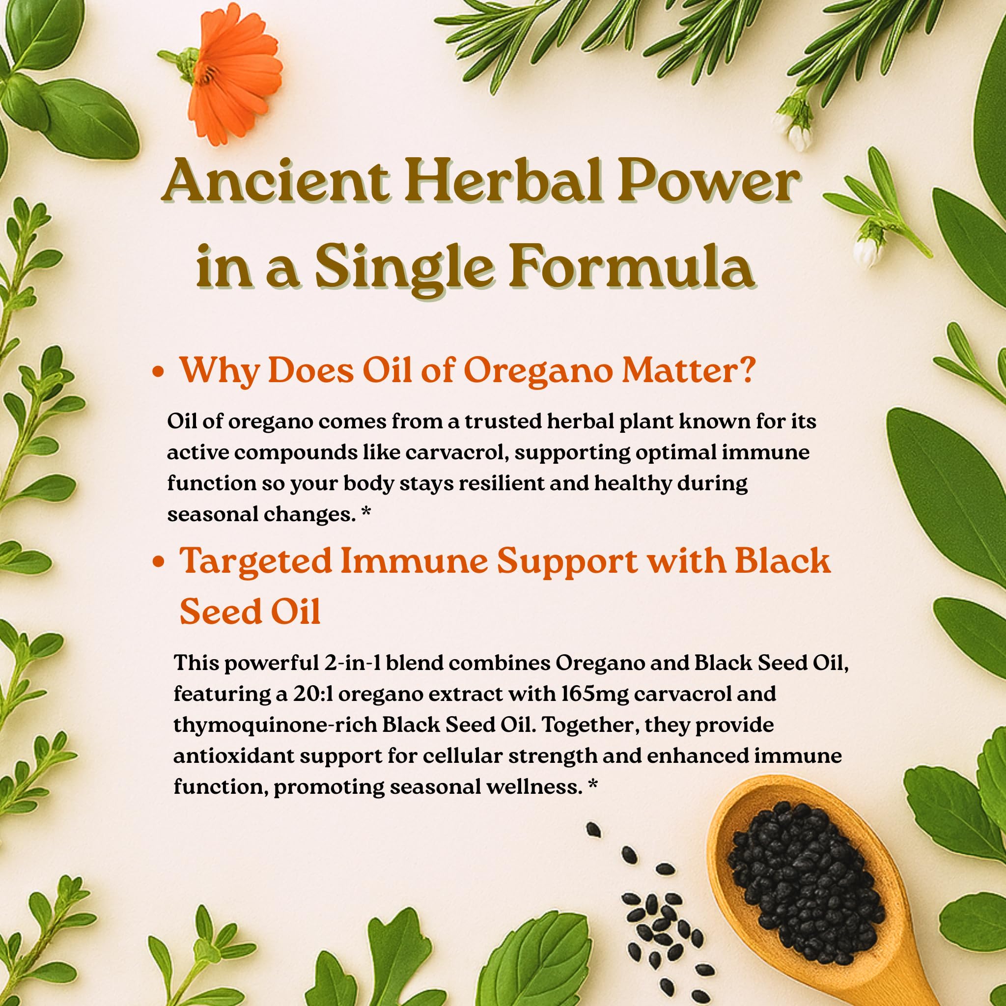 - Experience the potency of a fresh 300mg Oil of Oregano from Origanum minutiflorum leaves and 200mg Black Seed Oil from Nigella sativa per serving, a 2-in-1 complex that delivers 4X strength of carvacrol and thymoquinone.